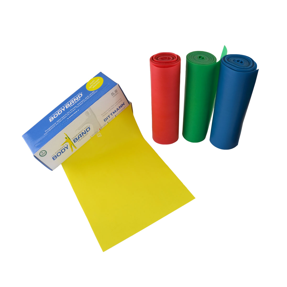 Trainingsband aus Latex zum Ausgleich von Bewegungsdefiziten, zur Kräftigung und Dehnung der Muskulatur. Das Trainingsband bzw. Body-Band ist in verschiedenen Längen und Widerstandsstärken erhältlich.