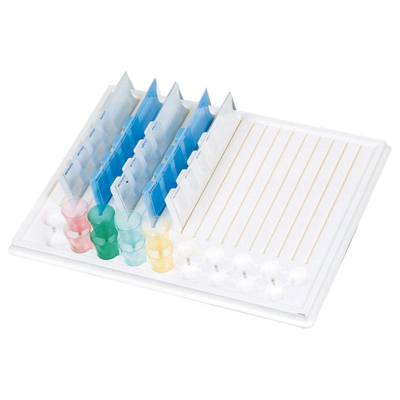 - Verteiltablett für 19 Tagesdispenser und 19 Medi-Becher