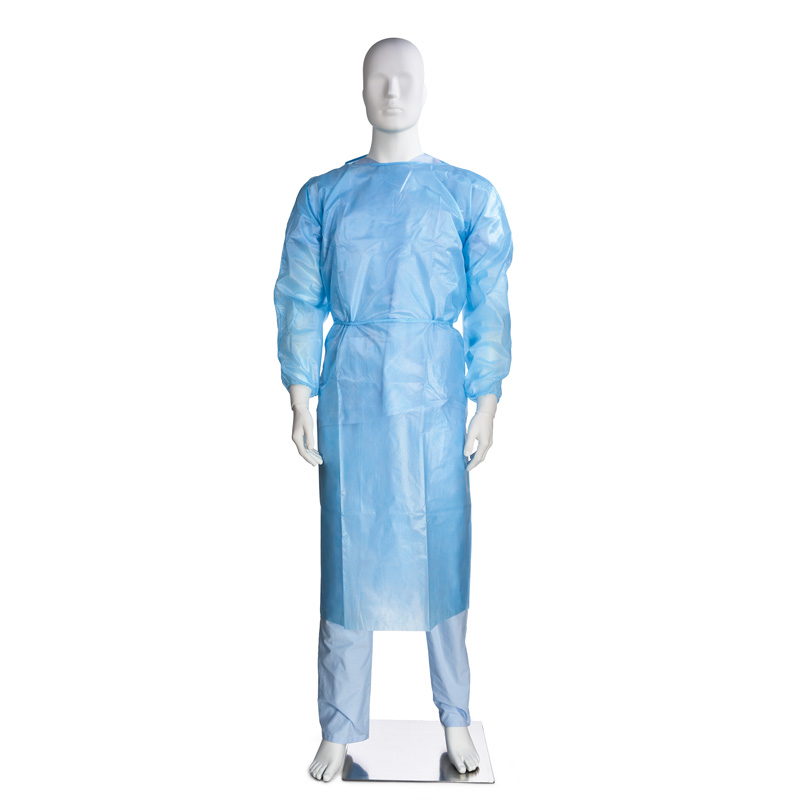 Der Schutzkittel mit Stoffbündchen besteht aus PP + PE, ist wasserabweisend, atmungsaktiv und hygienisch.
